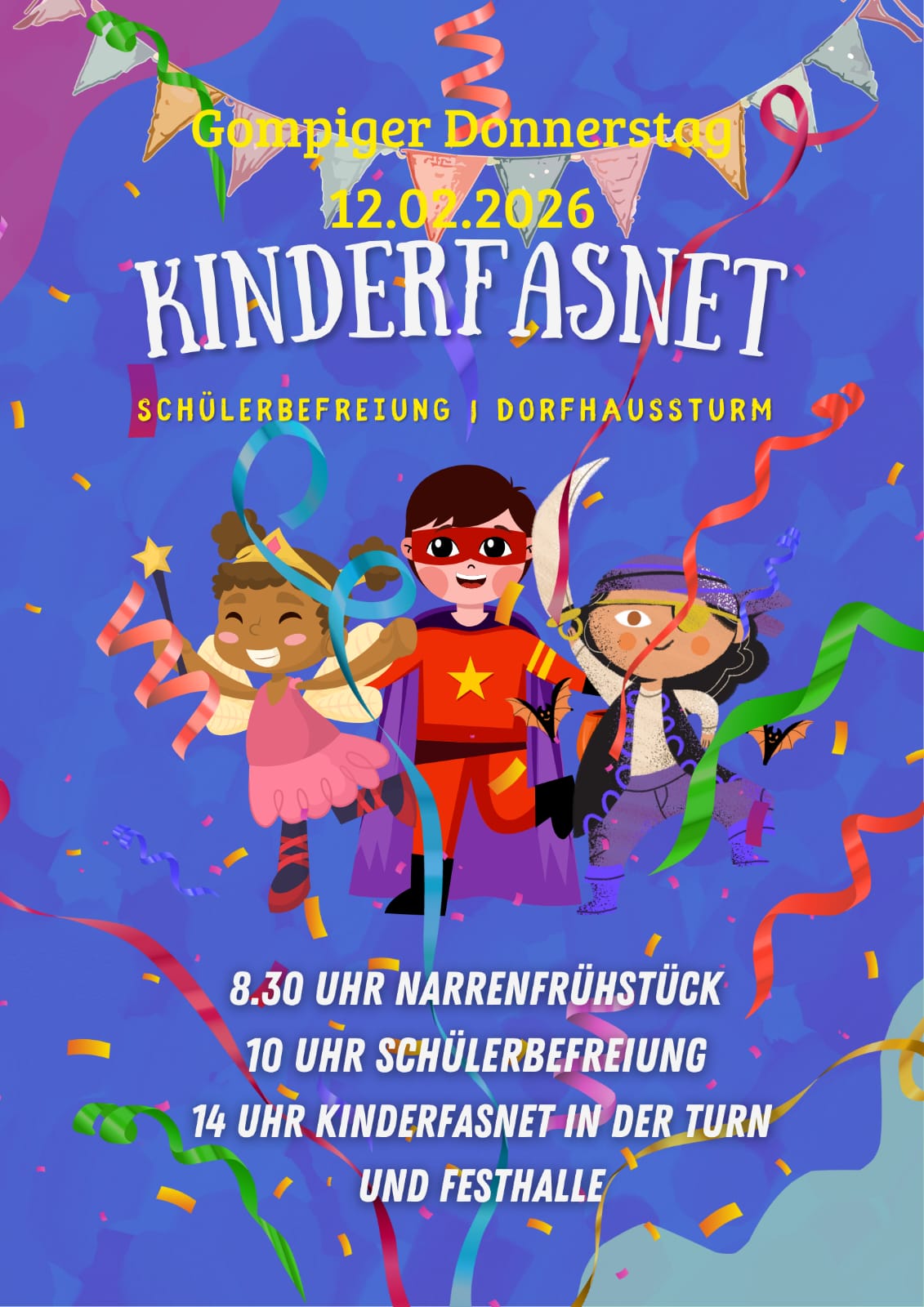 Am Donnerstag, den 12.02.26 findet traditionell die Kinderfasnet in Mittelbuch statt. Wir starten mit dem Narrenfrühstück um 08:30 Uhr, befreien die Grundschul- & Kindergartenkinder gegen 10:00 Uhr und laufen gemeinsam zur Dorfmitte zum Narrenbaumstellen. Im Anschluss ab 14:00 Uhr startet dann die Kinderfasnet in der Turn- und Festhalle Mittelbuch. Wir freuens uns auf Euer kommen!