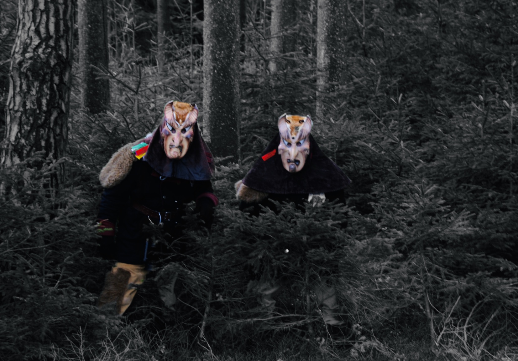 Die beiden Treiber tragen dunkle, waldgrüne Hosen und braune, knielange Jacken aus Wollstoff. Die Masken zeigen handgeschnitzte Gesichter mit schlichten, sachlichen Zügen.