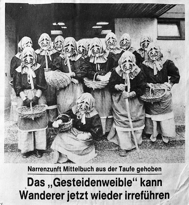 Gründung der “Narrenzunft Mittelbuch e.V.” mit etwa 35 Hästrägern mit der Maske “Gsteidaweible”.