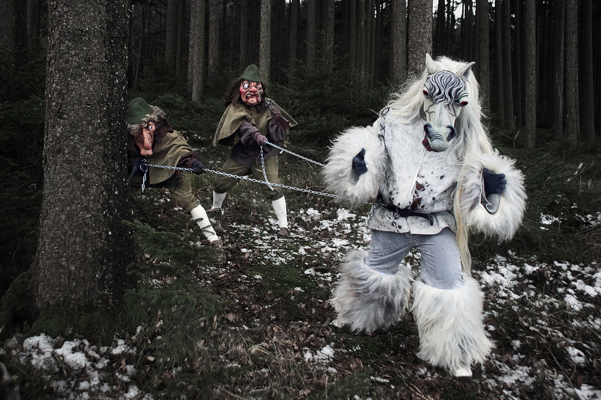 Die beiden Treiber tragen dunkle, waldgrüne Hosen und braune, knielange Jacken aus Wollstoff. Die Masken zeigen handgeschnitzte Gesichter mit schlichten, sachlichen Zügen.